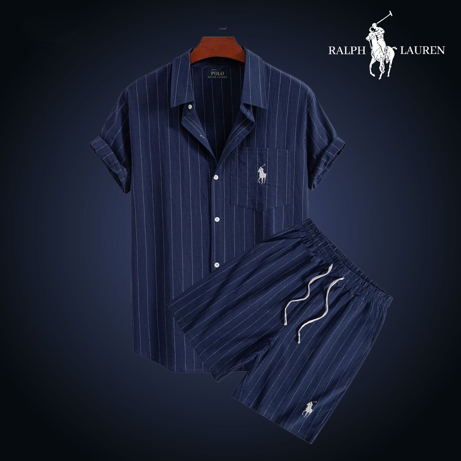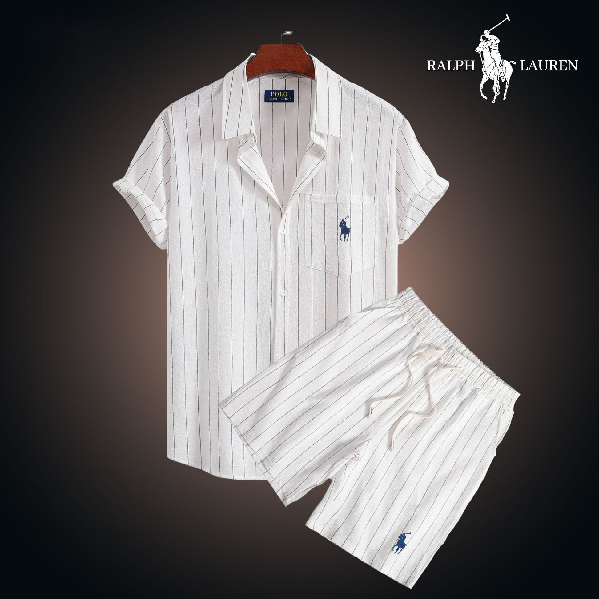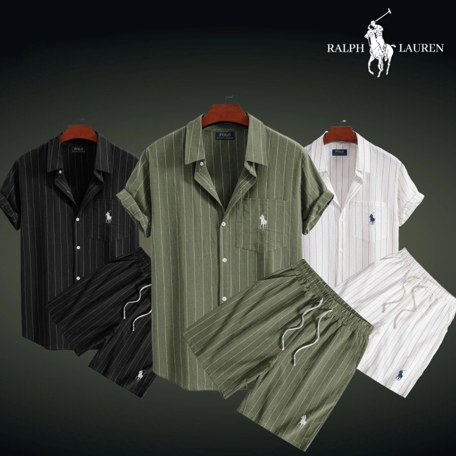 Each set includes a short-sleeve striped shirt and matching lightweight shorts, both embroidered with the famous R&L rider logo.
