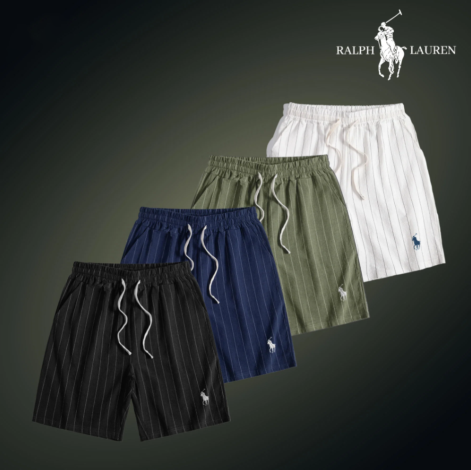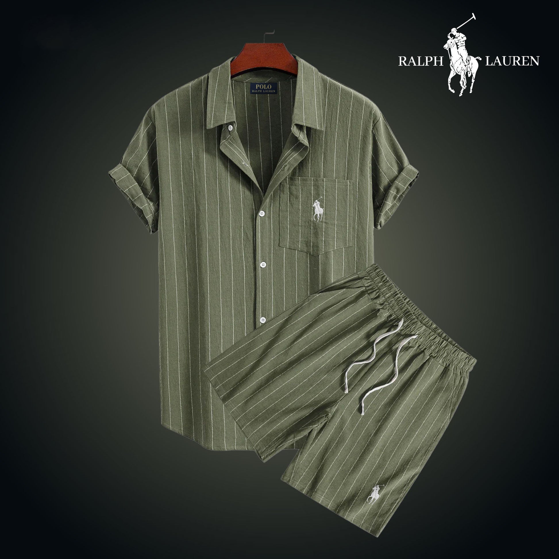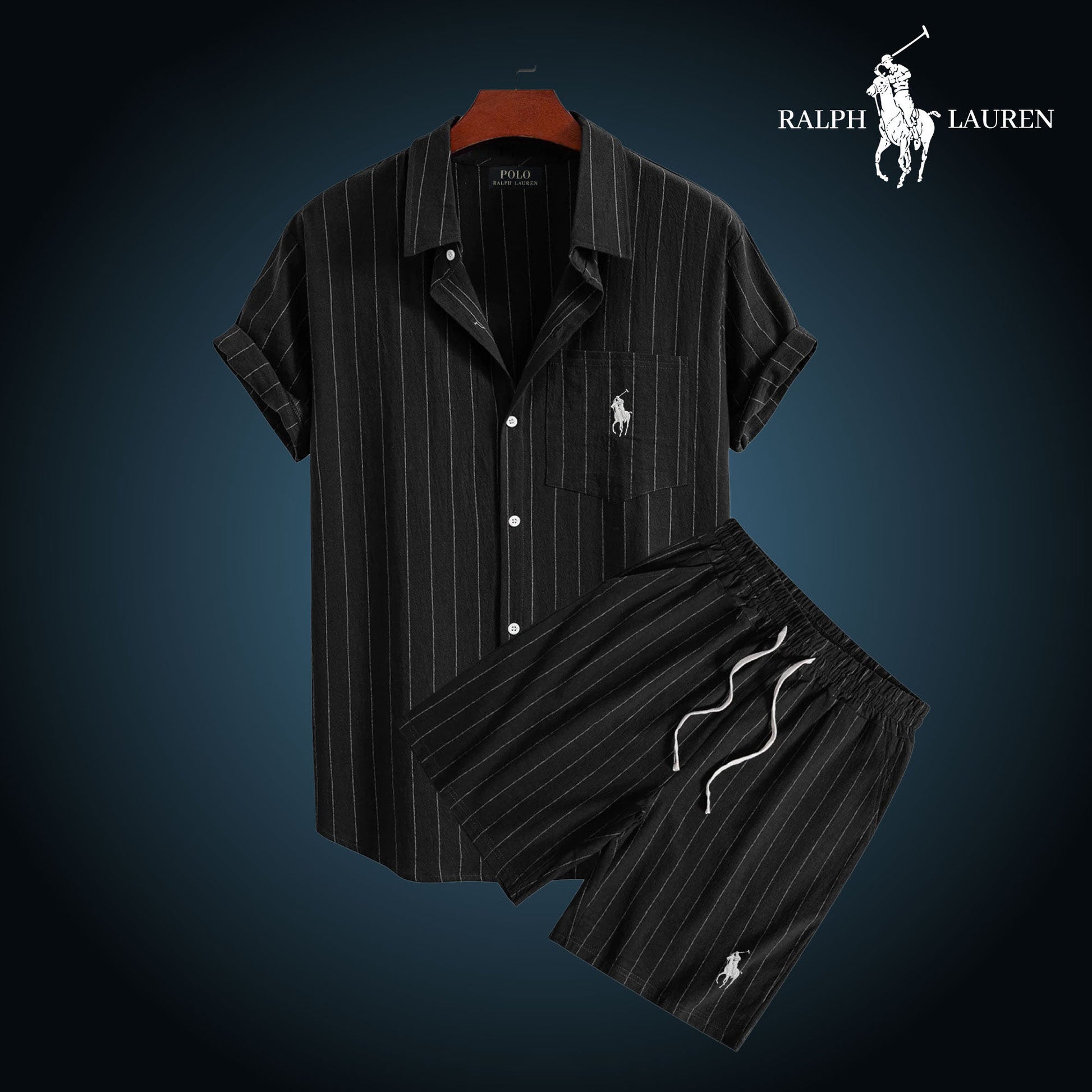 Each set includes a short-sleeve striped shirt and matching lightweight shorts, both embroidered with the famous R&L rider logo.